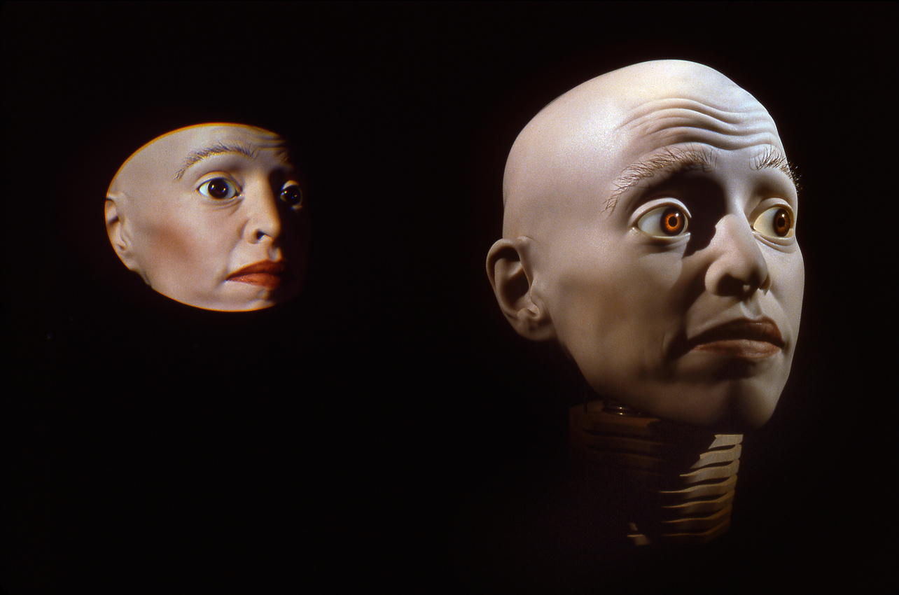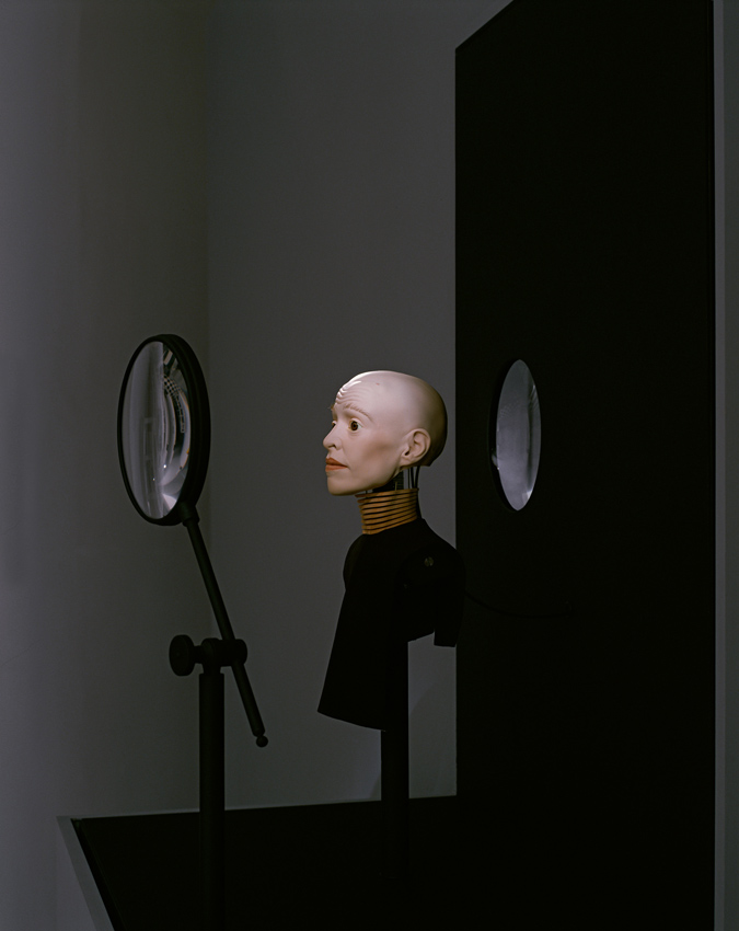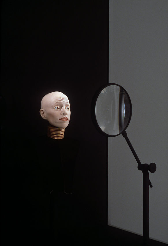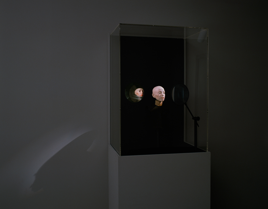 In a vitrine, a small portrait head is paired with its own virtual image. The image, moving in simple gestures of tilt and rumination, is a looped animation projected into the space of the vitrine via lens, mirror, and a hidden monitor. The sculpture, still in progress when this installation was first shown, was later completed as Silent Partner. The animation is an excerpt of the video Eidolon.
